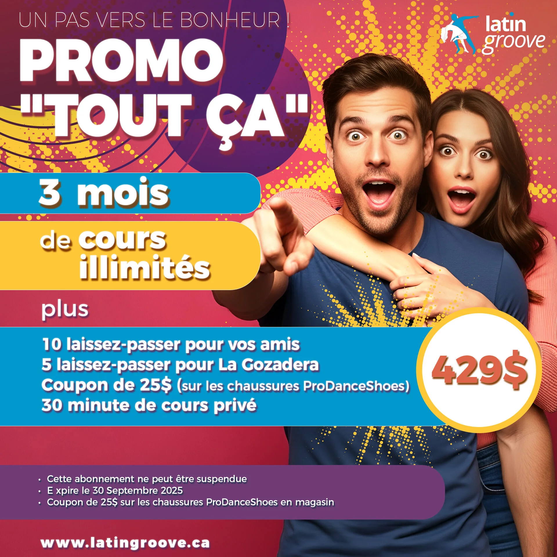 Profitez de 3 mois de cours illimités avec 10 laissez-passer amis, 5 laissez-passer La Gozadera et un cours privé de 30 minutes — le tout pour seulement 429$. Offre valide jusqu’au 30 septembre 2025. (Coupon de 25$ ProDanceShoes inclus.)