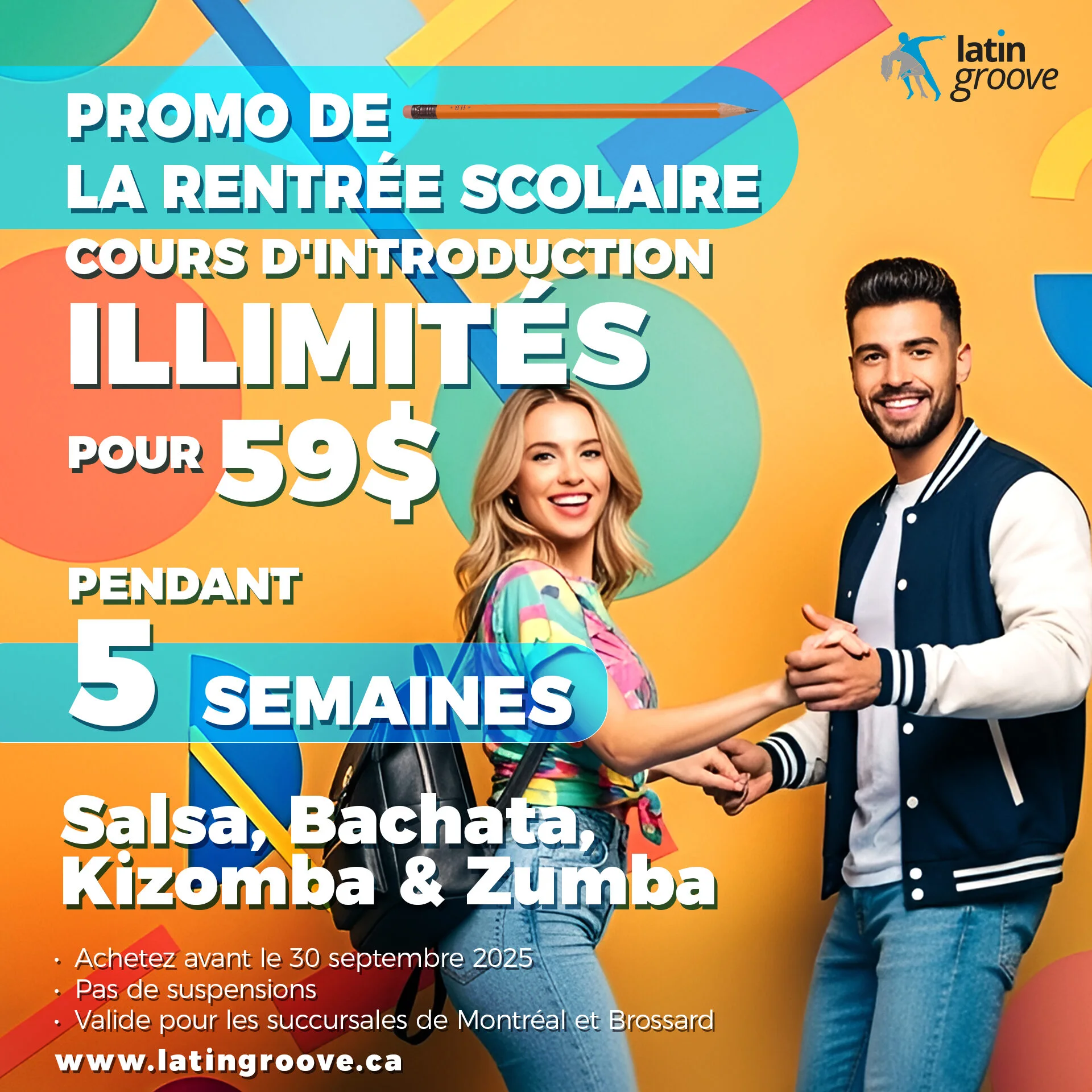 Lancez votre parcours de danse cette année scolaire avec notre offre spéciale “Retour à l’école de danse” ! Pour seulement 59 $, profitez de cinq semaines de cours d’introduction illimités en Salsa, Bachata, Kizomba, Zumba et Fitness. Idéal pour les débutants ou toute personne désireuse d’améliorer ses compétences en danse, nos instructeurs experts sont prêts à vous aider à trouver votre rythme. Agissez vite—cette offre se termine le 30 septembre 2024 et n’est pas transférable. Ne manquez pas votre chance de plonger dans un automne rempli de fun chez Latin Groove !